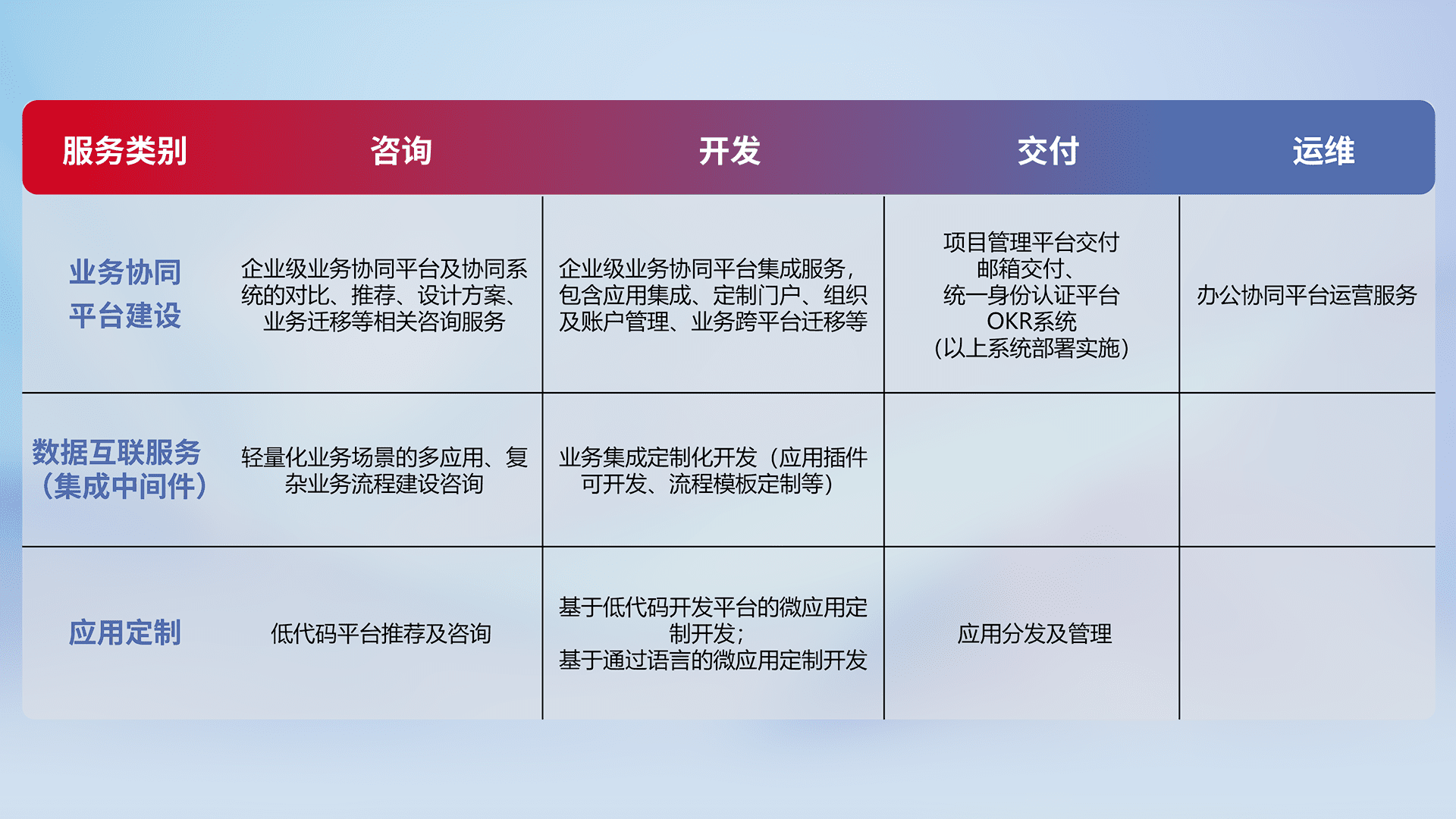 针对钉钉、、、、企微、、、IDaas等平台级产品提供产品的规划、、、、方案、、交付、、、定制化开发等服务,,,实现如统一协同办公、、、、智能客户服务、、、、混合会议管理、、、智能数据查询、、、等业务场景,,实现数字化转型。。