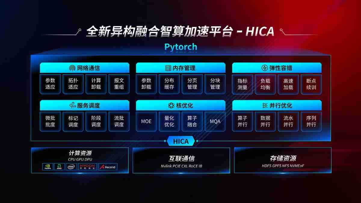 通过自研的服务层、、、、中间适配层、、以及调度编排算法,,,采用数据并行、、、模型并行等多种并行方式,,把并行计算任务进行有效的分解,,,使其分别由相应的软件栈和算力资源来承接。。。。当GPU资源变化,,,,HICA可以实时动态调度计算子任务并调整模型拓扑和架构,,,以充分聚合各种算力资源。。