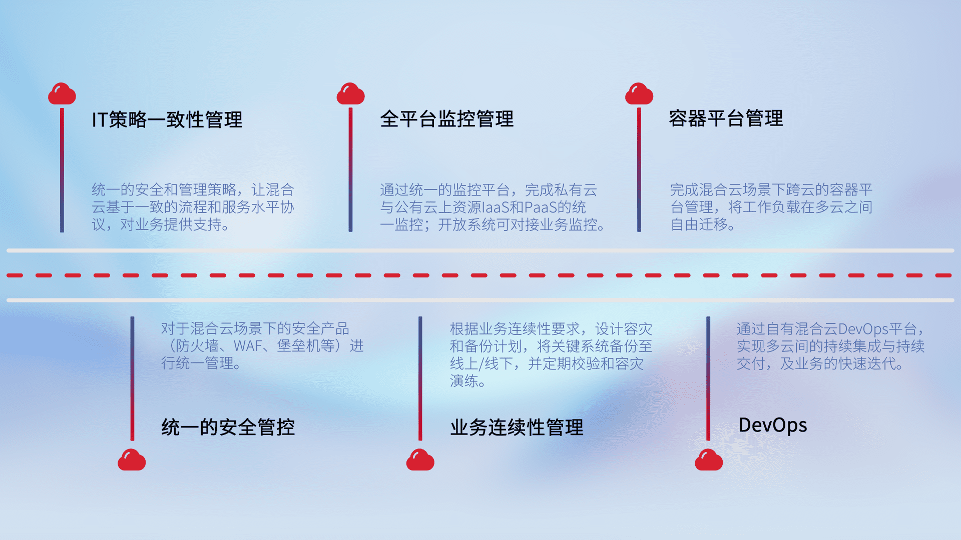 通过多云纳管,,,,以统一的资源数据模型把客户的云资源进行抽象和封装,,进而实现对多云资源的统一操作,,保障云资源管理的可靠性、、、、稳定性与可用性。。。。量身定制化运维内容,,,配置、、开发运维、、、补丁管理、、备份、、监控、、、认证和访问管理、、、、审计和日常巡检等,,,,保障在用云过程中的可靠度,,,稳定度以及高可用率。。