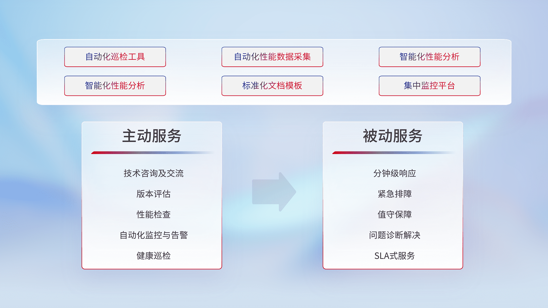 智能化工具和标准化文档,,,保障服务质量,,,提供主动服务(包含技术咨询、、、版本评估、、、性能检查、、、、自动化监控与告警、、、健康巡检)和被动服务包含(分钟级响应、、、紧急排障、、、、值守保障、、问题诊断解决、、、、SLA服务)。。。